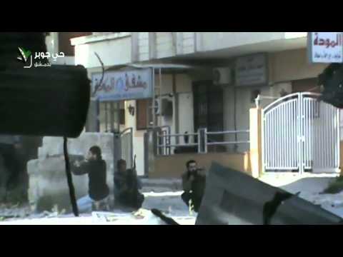 شام دمشق جوبر الجيش الحر يقوم بانتشال امرأة مصابة من أمام قناصة قوات النظام 6-4-2013