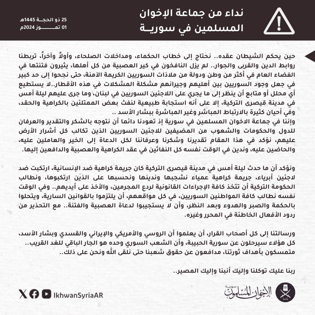 \ نداء من جماعة الإخوان المسلمين في سورية حول أحداث مدينة قيصرى التركية